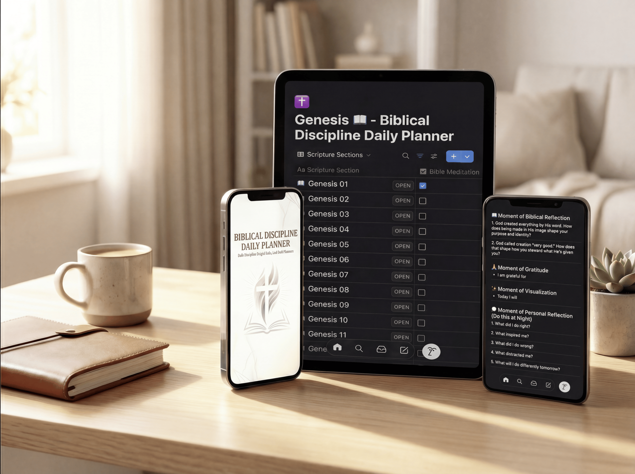 A daily planner that guides you through Scripture, reflection, gratitude, and focus — so you can start and end each day aligned with God.